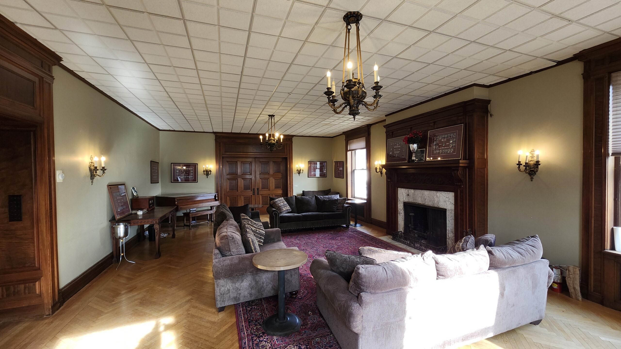 Common area with a large functioning fireplace, great place to lounge with fellow members, study, watch a show, or practice your piano skills!